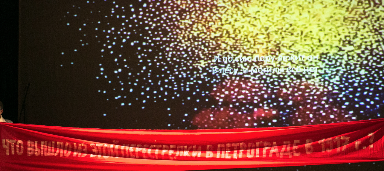 Актеры, представившись собственными именами, заняли места за покрытым красным сукном вытянутым столом, и под аккомпанемент электронной музыки Саши Сулиммы началась «лекция» одновременно на английском, немецком и русском языках. На протяжении действия перед глазами зрителя пролетает весь «короткий двадцатый век», истоком которого в спектакле становятся события 1917 года. Главная тема — революция: какой она была и могла быть, где ее начало и конец.